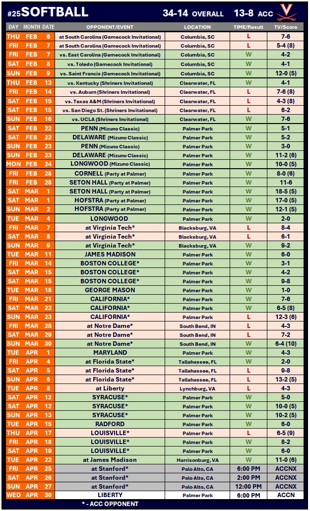 Virginia continues to play on the road, heading to the west coast for a three-game series at No. 15 Stanford as the Cavaliers close out ACC play. The series is set to begin on Friday with a 9 p.m. EDT first pitch.