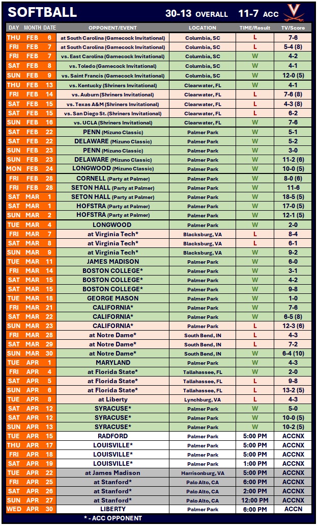 — Virginia Softball (@UVASoftball) April 13, 2025