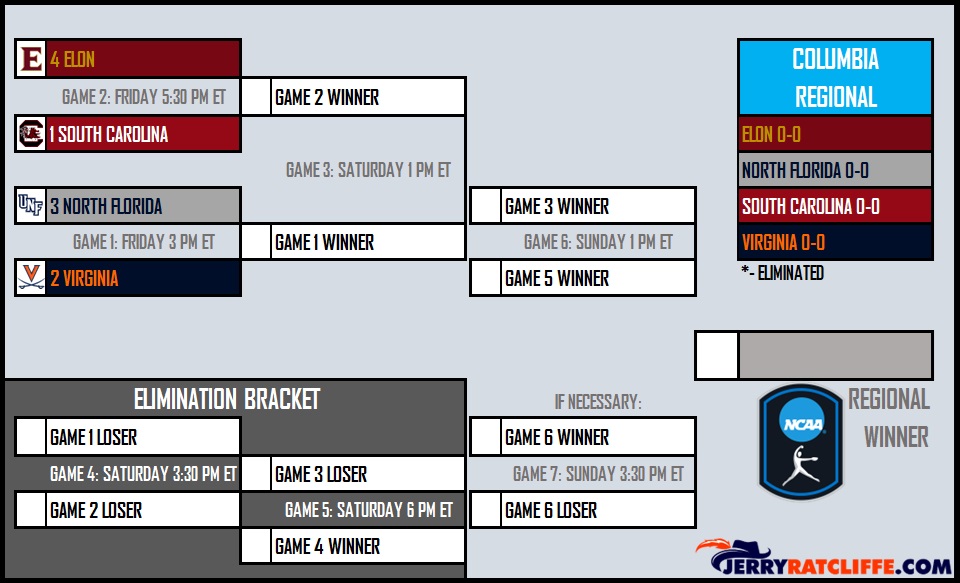 The Cavaliers (37-17) will face third-seeded and ASUN Champions North Florida (45-13) in the opening game on Friday (see full bracket below). The winner of that game will advance to face the region’s top seed South Carolina (40-15) or Elon (33-19). The Gamecocks are the No. 8 overall seed in the tournament. The regional tournament format is double elimination.