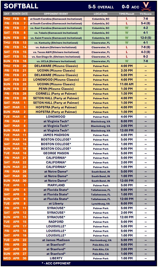 Virginia is set to open play at home next weekend with the Mizuno Classic at Palmer Park. Play is slated to kick off on Thursday against Delaware at 4 p.m. and continue through the weekend. Teams participating in the tournament includes Delaware, Longwood, Penn and UConn.