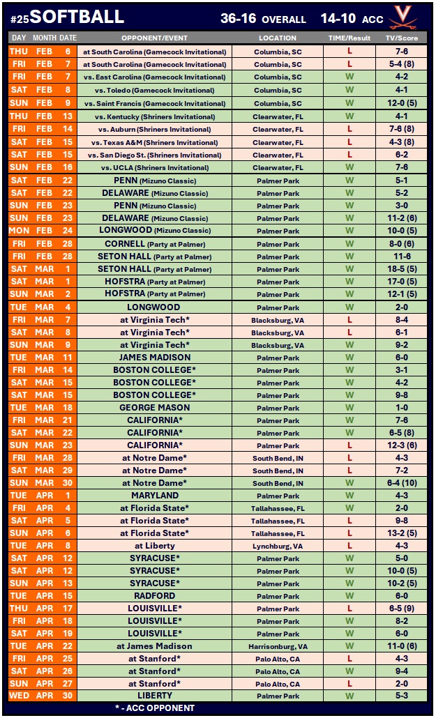 Virginia will play in the ACC Tournament next week and awaits seeding and opponent information that will be announced upon the conclusion of this weekend’s ACC games. The Cavaliers have a bye weekend due to finals this weekend.