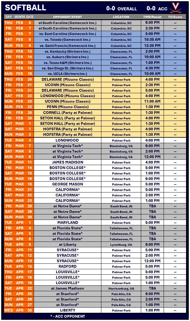 The Cavaliers are coming off a 34-20 season in 2024 and finished the year ranked No. 22 in the final Softball America poll after advancing to the championship game of the NCAA Knoxville Regional against No. 3 Tennessee.