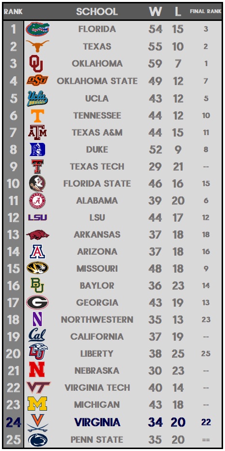 Virginia is ranked No. 24 in the Softball America preseason Top 25, it was announced by the publication on Monday with the release of its annual preseason poll.