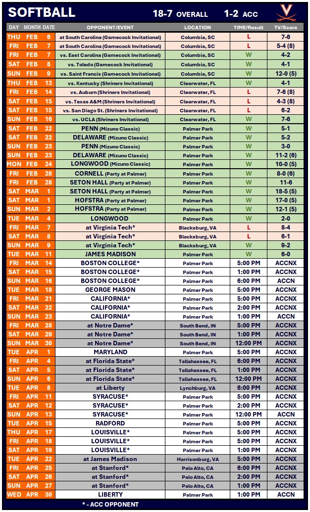 Softball: UVA notches 6-0 shutout win over JMU in midweek action