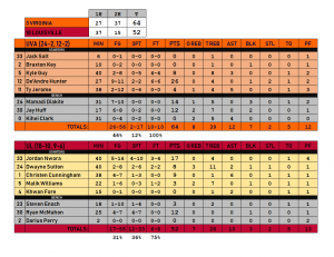 The ‘Hoos shot 46 percent (26 of 56) and 12 percent (2 of 17) from long distance, dominating the rebound battle 39-28. Each side committed 5 turnovers. Virginia outscored Louisville 38-4 in the paint.
