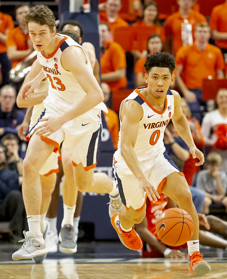 Kihei Clark and Kody Stattmann start a Cavalier fast break following a steal against Syracuse (Photo by John Markon).