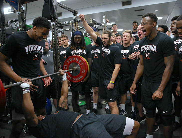 At 6 a.m. sharp, the morning silence was broken with the Cavaliers’ offensive players roaring down the hallway from the locker room to the weight room, where they would perform as many 225-pound bench press reps as they could as teammates urged them on in a wild frenzy of emotion. Then it was the defense’s turn.