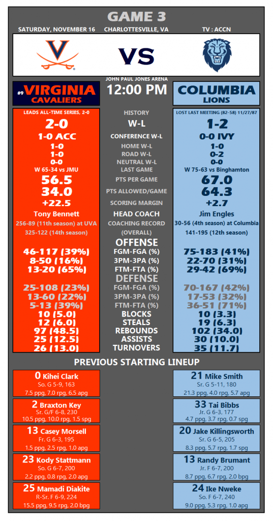 No. 9 Virginia continues its initial homestand of the season at John Paul Jones Arena Saturday afternoon against Columbia (12 p.m. tipoff, ACC Network). The Cavaliers (2-0, 1-0 ACC) look to make it three straight wins to start a season for the fourth year in a row under Tony Bennett.