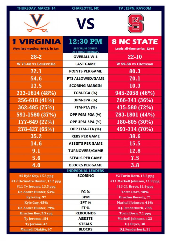 No. 1 seed Virginia tips off its 2019 ACC Tournament at 12:30 Thursday afternoon with a quarterfinal matchup against eighth-seeded NC State at the Spectrum Center in Charlotte.