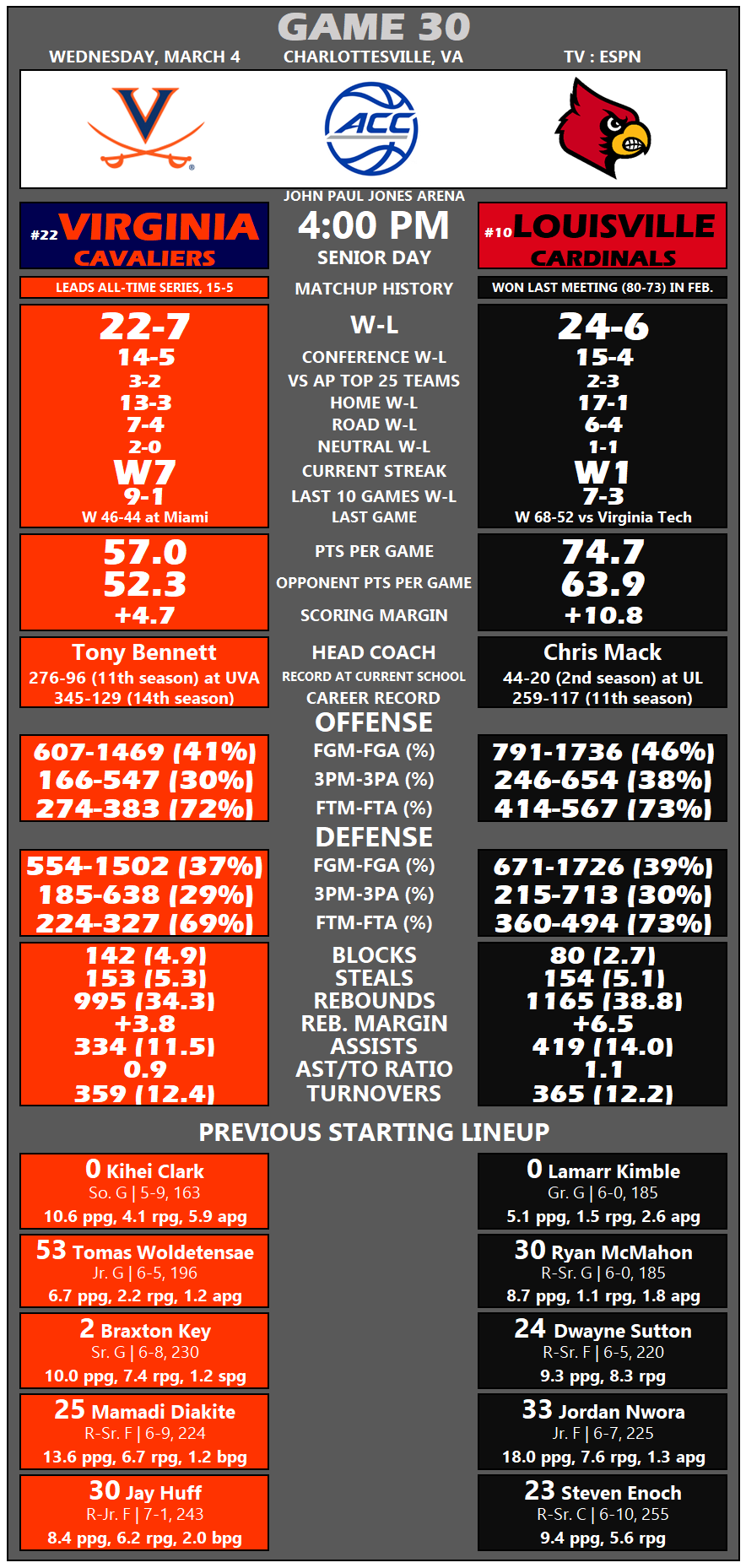 The Wahoos (22-7, 14-5 ACC) are looking for a season split with the Cardinals (24-6, 15-4), who prevailed in an 80-73 thriller in the first meeting at the KFC Yum! Center on Feb. 8.