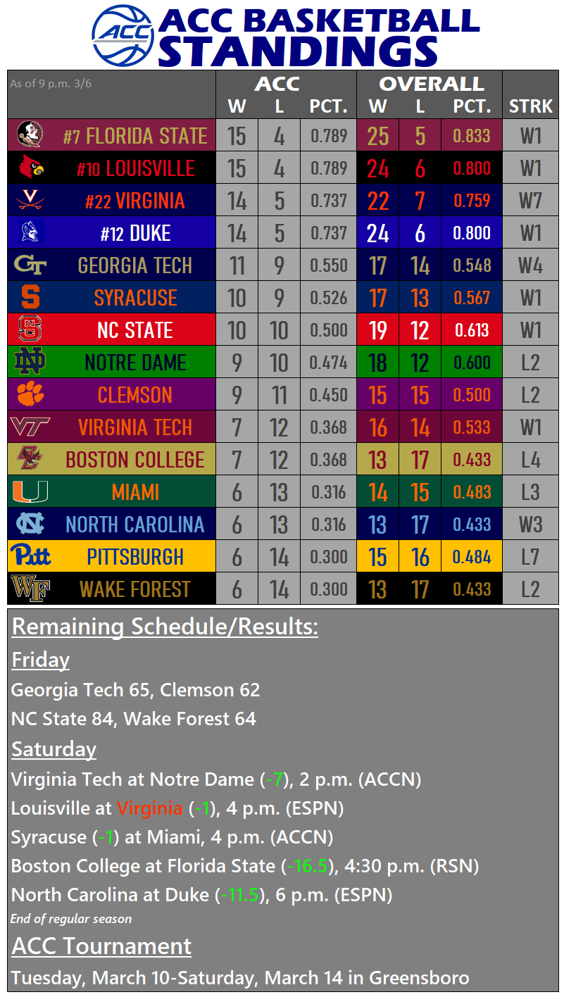 Virginia, a slim 1-point favorite, enters Saturday on a seven-game win streak, having not lost since falling in Louisville nearly a month ago. The Cardinals are just 3-3 since then, with losses — all on the road — at Georgia Tech (64-58), Clemson (77-62) and Florida State (82-67). UVA has won five straight at JPJ, including a pair over teams ranked in the top 10, while Louisville is 6-4 on the season away from home.