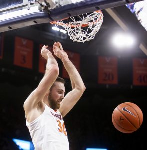 Jay Huff, who led Virginia with 15 points, enjoys a close-up view of a second-half dunk against Duke (Photo by John Markon).