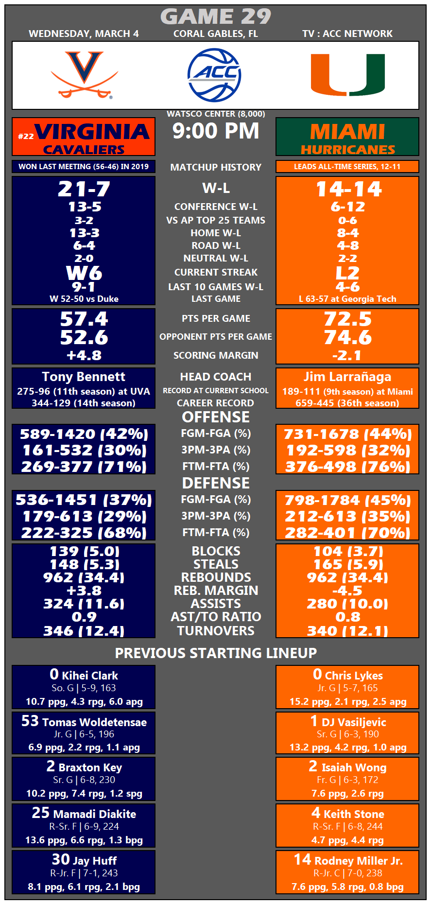 The ‘Hoos have won five of their last six ACC road games (three in a row) by a combined 15 points, so Bennett’s troops have proven that they can emerge victorious in close games in hostile environments. Miami is 8-4 at the 8,000-seat Watsco Center this season.