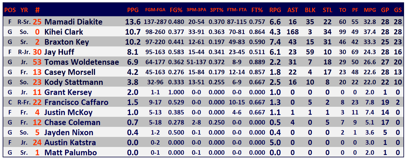 In the middle is 7-foot redshirt-junior center Rodney Miller Jr. (7.6 ppg, 5.8 rpg), while 6-10 forward Sam Waardenburg (the team’s top rebounder with 5.9 a night) and 6-9 forward Anthony Walker each contribute significant minutes in the post for Larrañaga’s squad as well.
