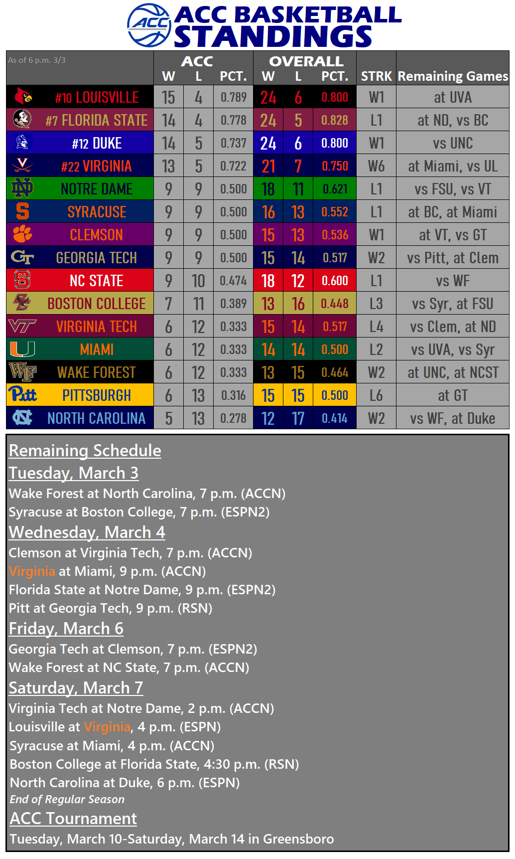 With the rematch against No. 10 Louisville on Senior Day looming this weekend (Saturday, 4 p.m. on ESPN), the Cavaliers can’t afford to look past the Hurricanes and risk putting a dent in their impressive late-season resume. Larrañaga will have his team ready to go, no doubt about it, as the Canes are fighting to move up the standings for better seeding next week.
