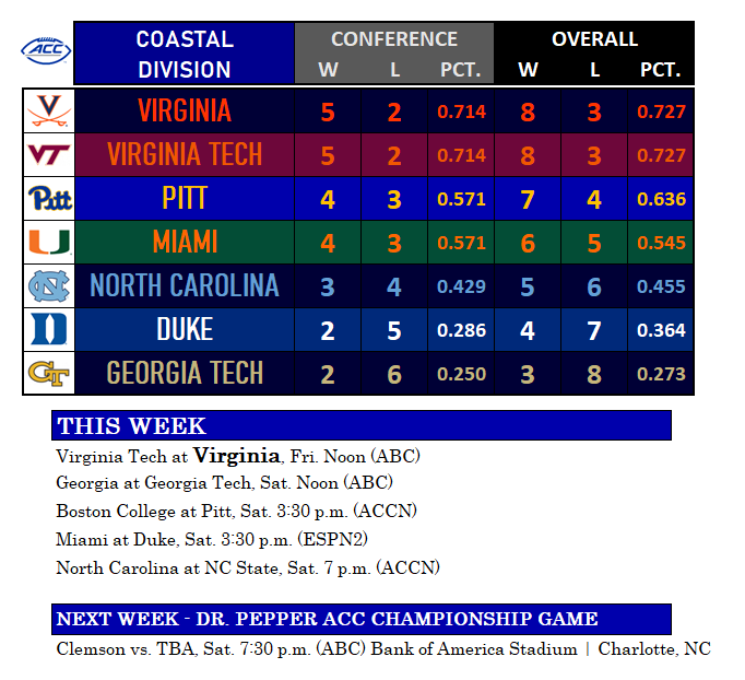 The winner will claim the division championship and will face Atlantic Division winner Clemson, the No. 3 team in the land, in next weekend’s ACC Championship game in Charlotte.