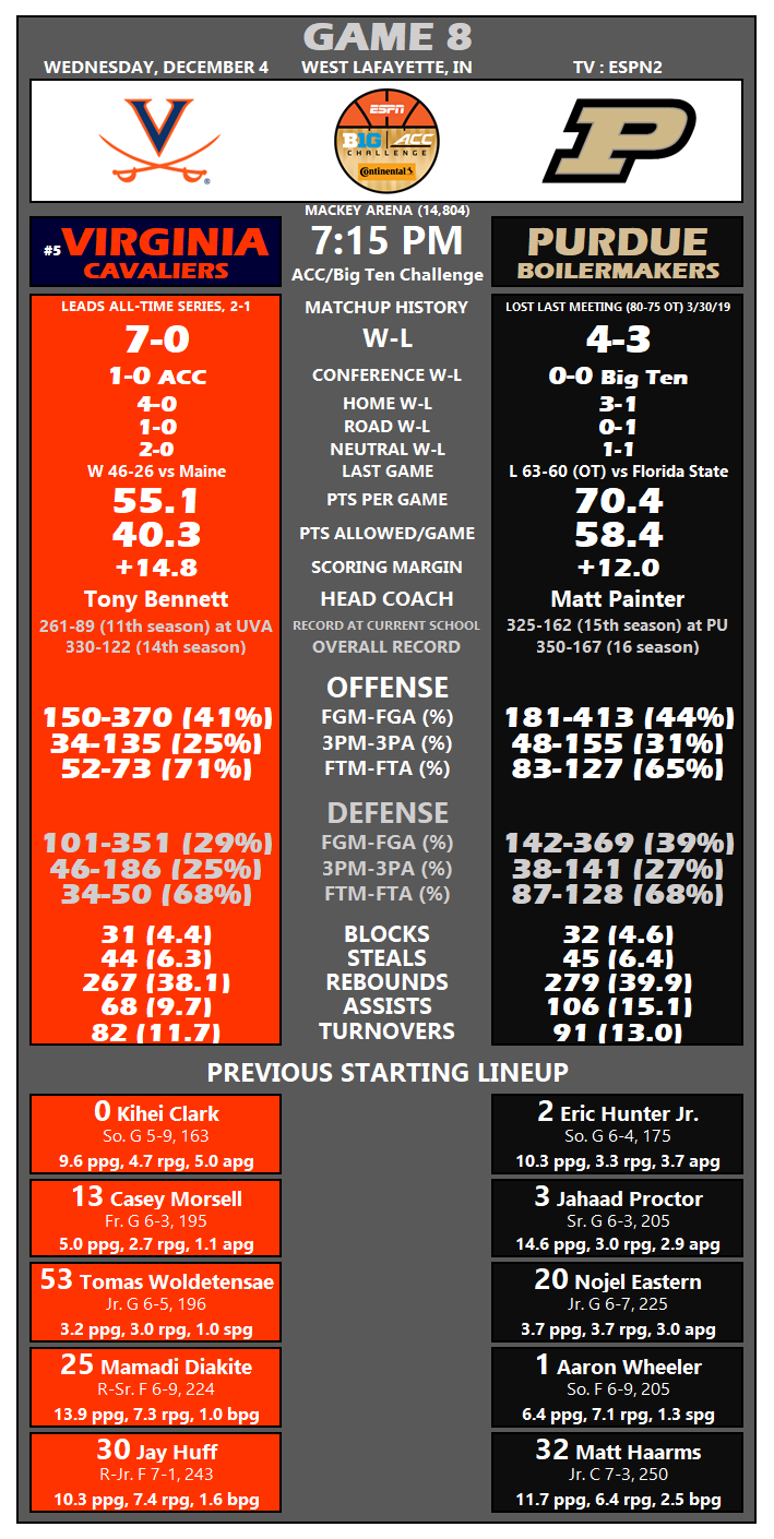 Wednesday night, the two squads will square off for a rematch, although with a much different feel. No. 5 UVA (7-0) and Purdue (4-3) will both have several new faces on the floor for this ACC/Big Ten Challenge matchup (7:15 p.m., ESPN2).