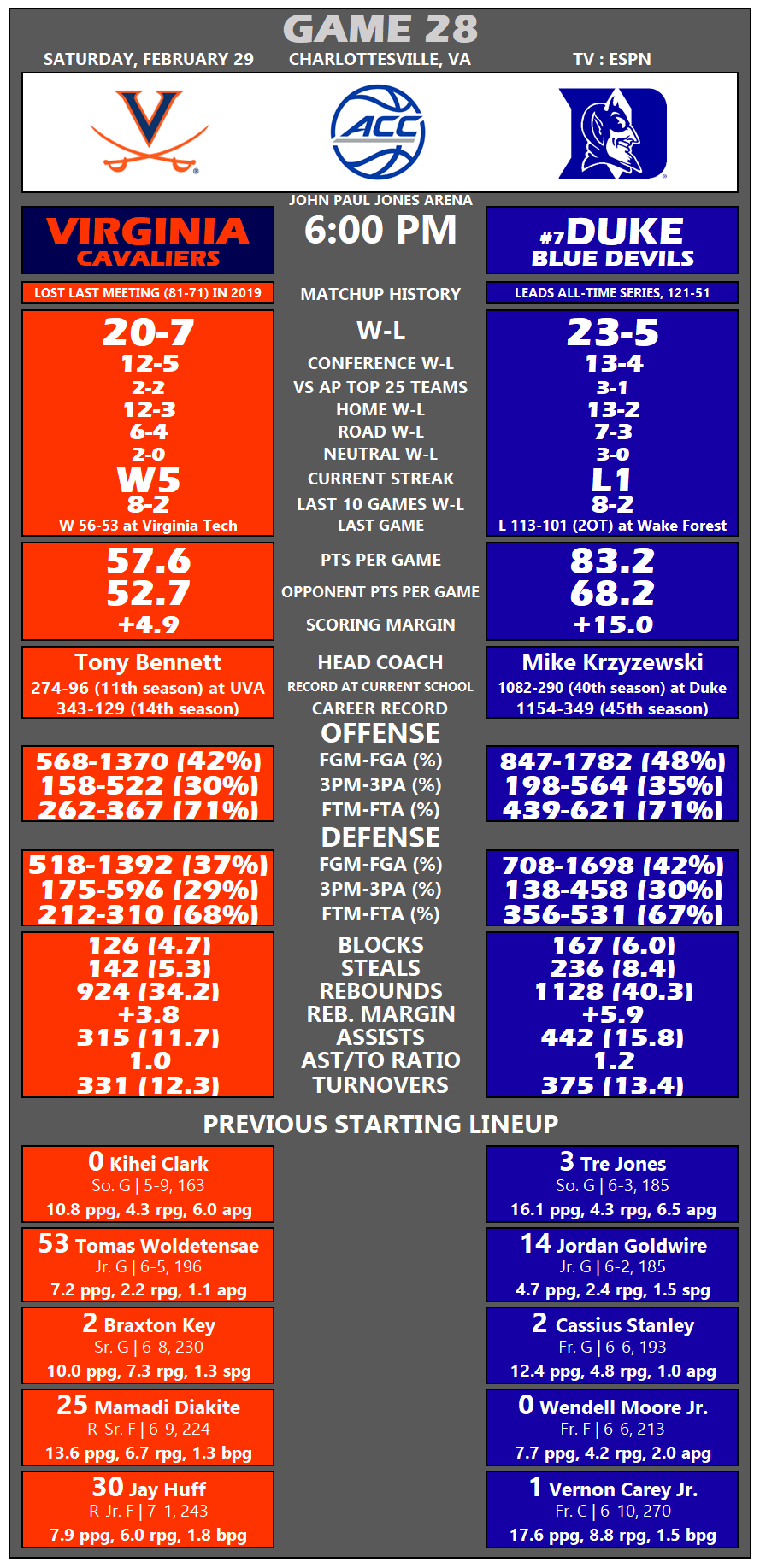 Tale of the Tape: No. 7 Duke at Virginia