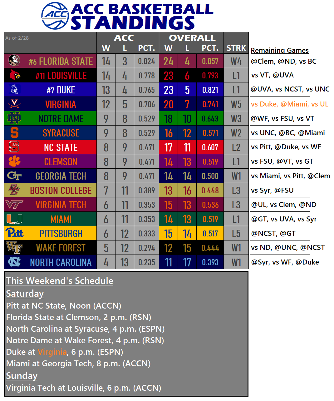 With a win Saturday, Virginia would technically slide ahead of Duke into third place in the standings with a week to go, as well as own the head-to-head tiebreaker, should the ‘Hoos and Devils finish with identical conference records.