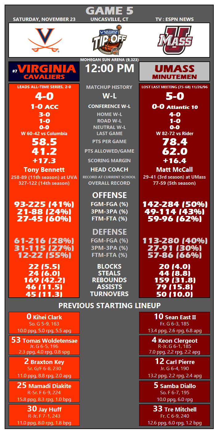 No. 7 Virginia travels to Uncasville, Connecticut for this weekend’s Air Force Reserve Tip-Off Tournament, and will go up against Massachusetts today at Mohegan Sun Arena. The game will tip off at 12 noon and will be televised on ESPN News.
