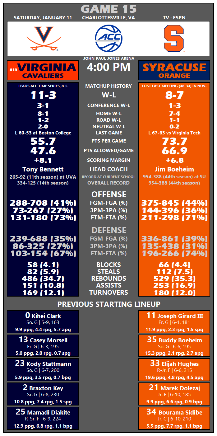 Virginia, which has won four in a row and seven of the eight ACC meetings against Syracuse, enters Saturday’s game ranked 35th overall by KenPom (1st AdjD, 204th AdjO), while the Orange are 69th overall (34th AdjO, 124th AdjD).