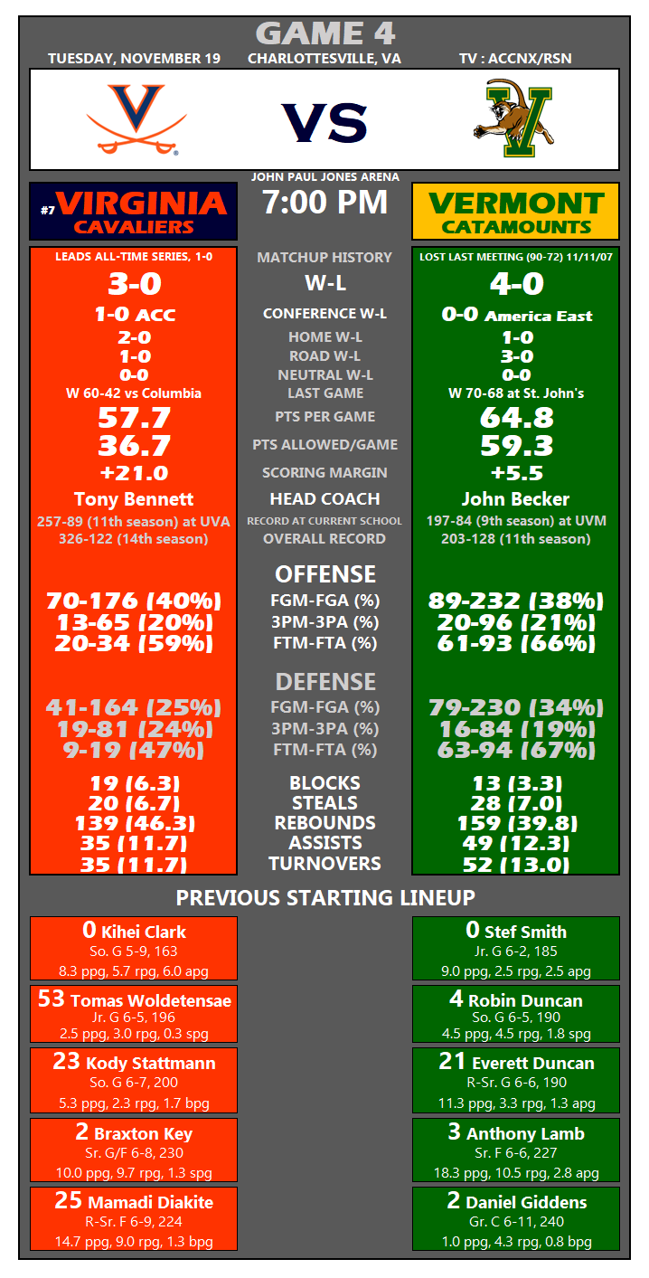 That process will continue tonight when the No. 7 Cavaliers host unbeaten Vermont (4-0) at 7 p.m. (Regional Sports Networks). The visiting Catamounts are coming of a 70-68 victory at St. John’s, and received 11 voting points in this week’s Associated Press Top 25 poll, the most by a Vermont team since the 2004-05 season when famed Tom Brennan was the coach.