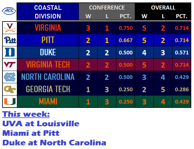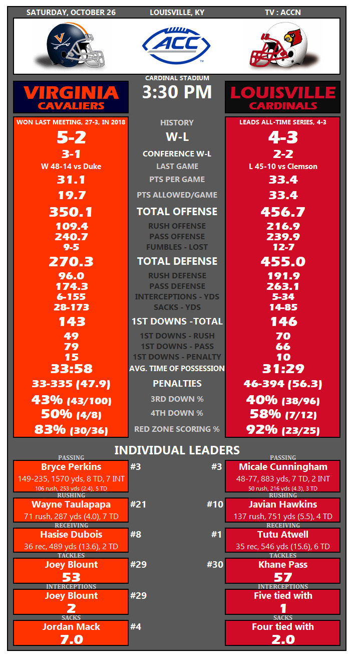 Here is a breakdown of Saturday afternoon’s Virginia at Louisville game, where the Cavaliers will attempt to remain alone in first place in the ACC Coastal Division race: