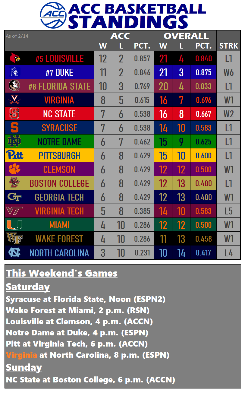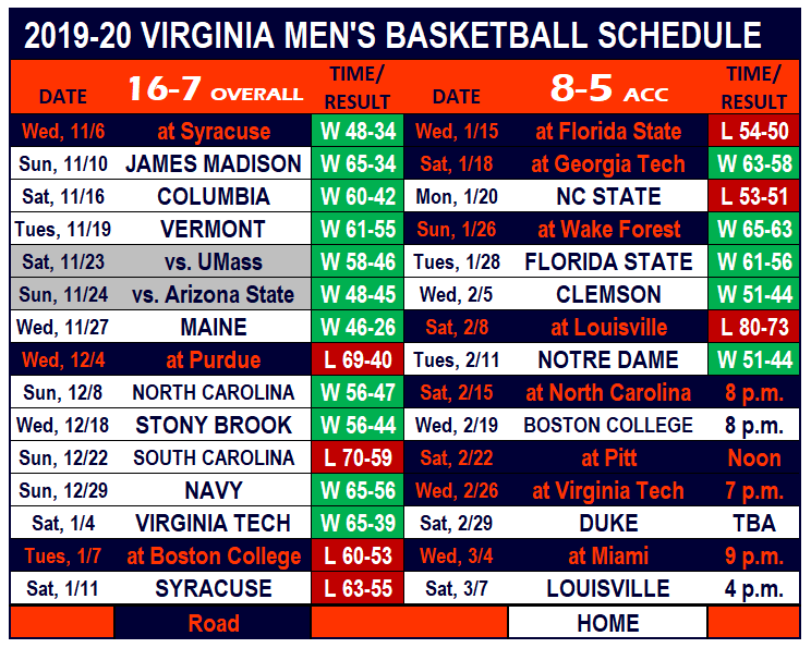 The ‘Hoos can take another significant step towards a possible top-four seed and double-bye in next month’s ACC Tournament in Greensboro with a win tonight. Virginia sits alone in fourth place with a one-game lead over NC State and Syracuse, both 7-6 in league play entering the weekend.