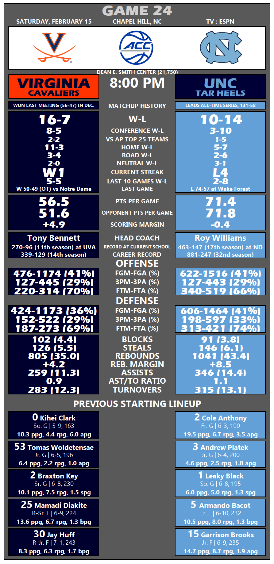 Heading into Saturday’s action, Virginia ranks 51st overall according to KenPom (3rd AdjD, 250th AdjO), while the Heels are at No. 95 (73rd AdjD, 142nd AdjO). In the latest NCAA NET Rankings, UVA is No. 56, UNC is No. 95.