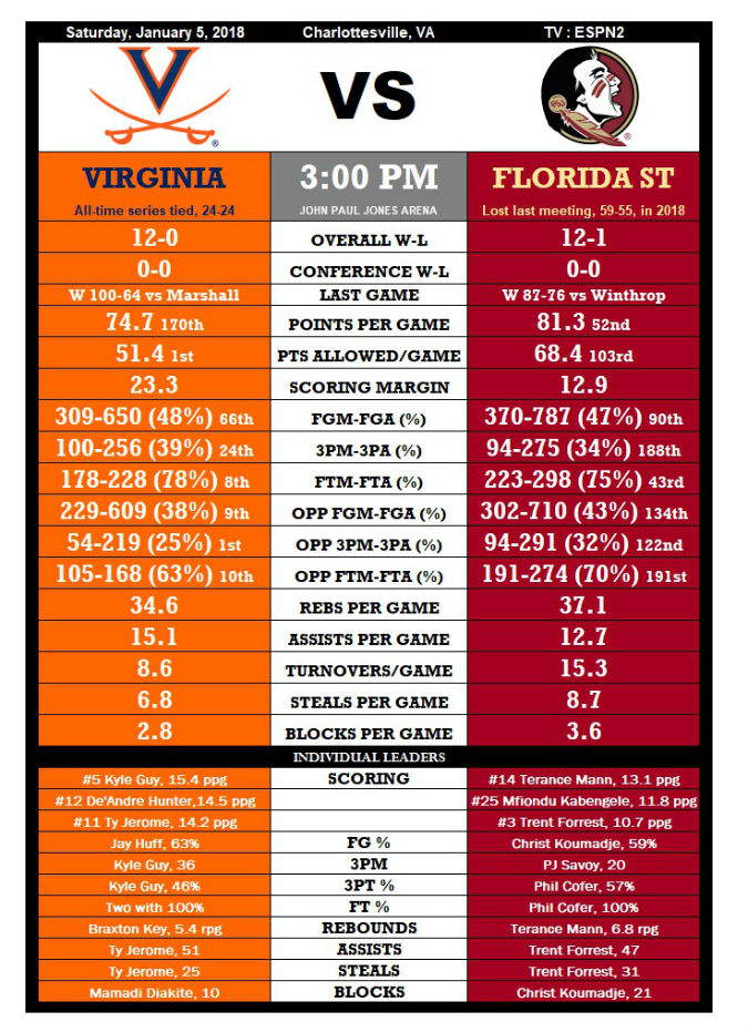 Up front, 7-4 senior center Christ Koumadje will be a tough matchup for the ‘Hoos, along with 6-9, 235-pound sophomore forward Mfiondu Kabangele, who hasn’t started a game for the ‘Noles but averages 18 minutes off the bench and is the team’s second-leading scorer with 11.8 points per game.