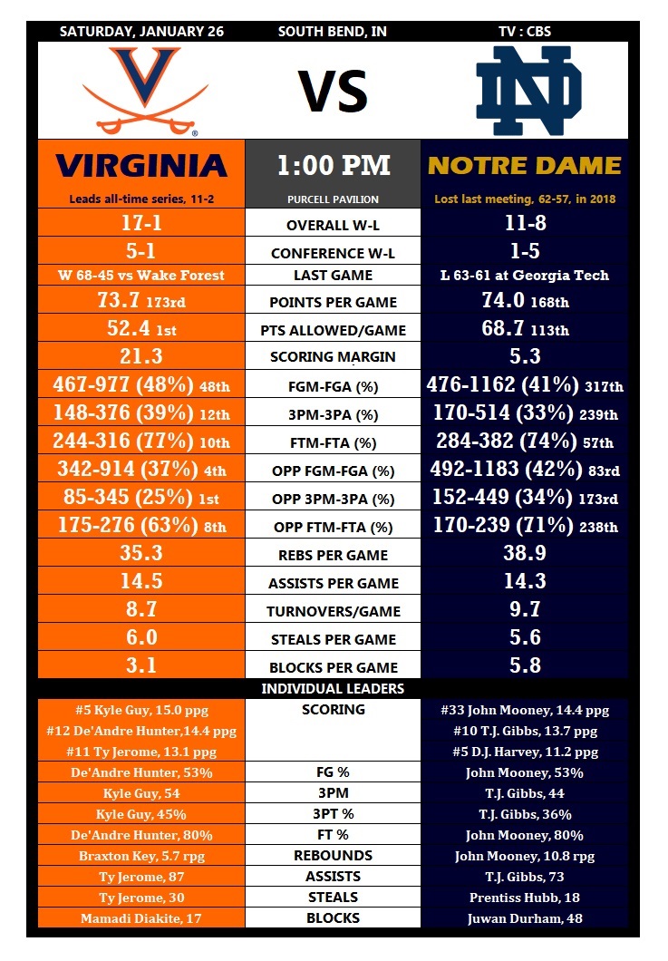Virginia’s men’s basketball team hits the road for its next two games, beginning with Saturday’s trip to Purcell Pavilion to tangle with Notre Dame. Tipoff is set for 1 p.m., and the game will be nationally televised by CBS.