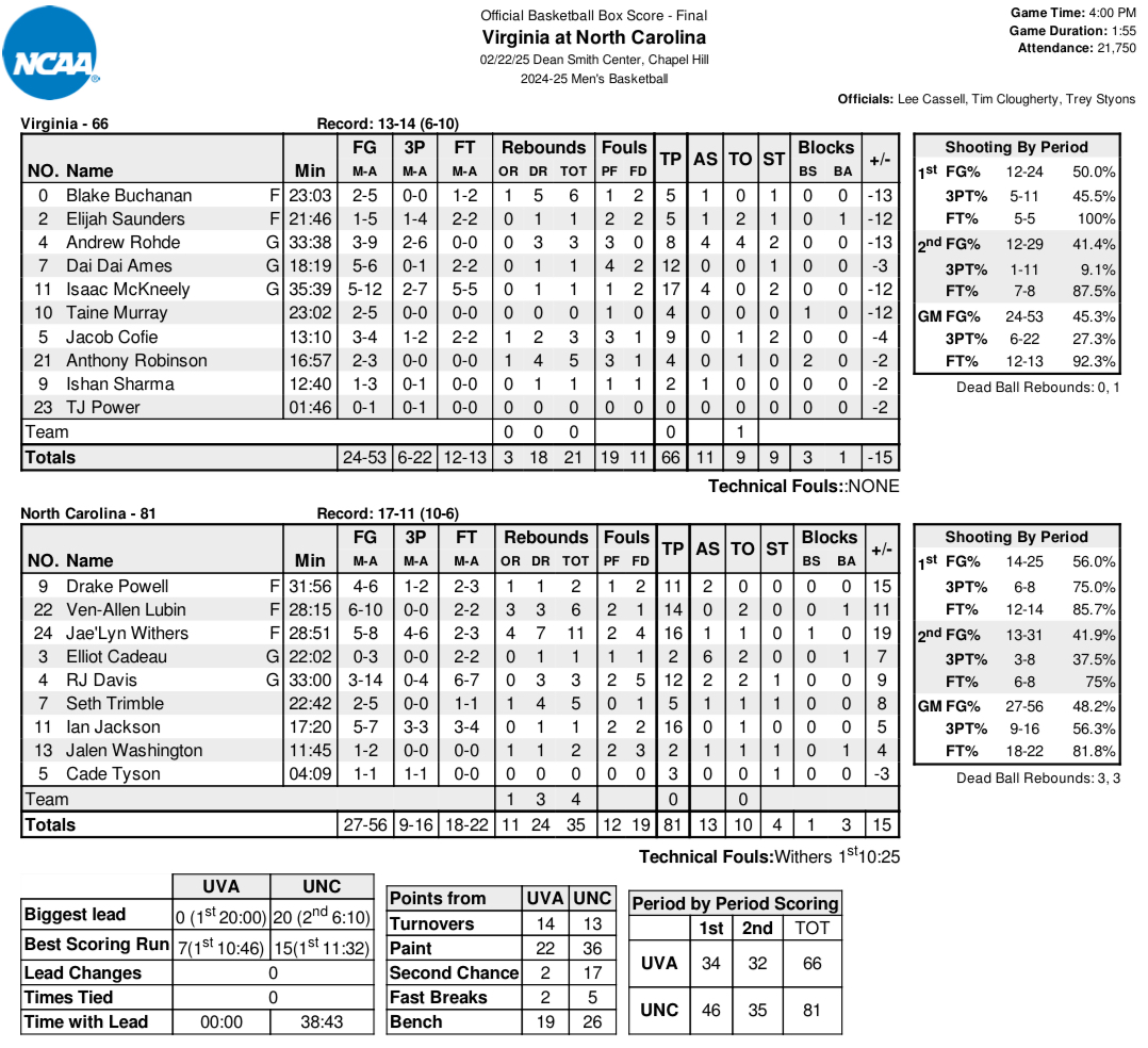 Carolina outrebounded UVA, 35-21 (the Cavaliers had only 3 offensive rebounds), outscored Virginia in the paint, 36-22, outscored the Wahoos 17-2 on second chance points. Anytime UVA made a run, the Tar Heels answered.