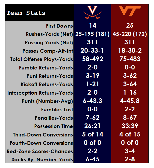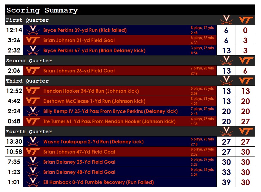 RUSHING: VT — Deshawn McClease 16-86; Hendon Hooker 21-44; Tre Turner 3-25; Keshawn King 3-11; Dalton Keene 2-6. UVA — Bryce Perkins 19-164; Wayne Taulapapa 6-17.