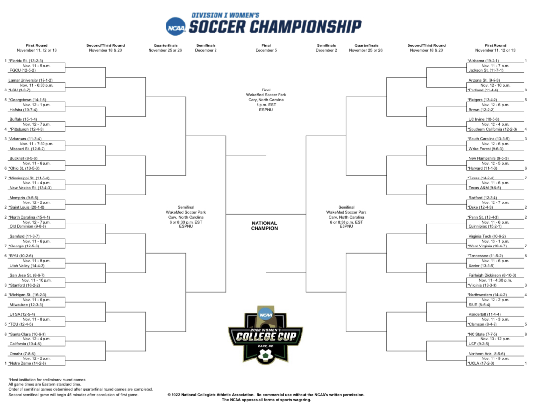 The NCAA Tournament field consists of 64 teams with first-round matchups happening at 32 campus sites. Play will continue on campus sites until the College Cup with the final four teams will be held the weekend of Dec. 2-5 at WakeMed Soccer Park in Cary, N.C.