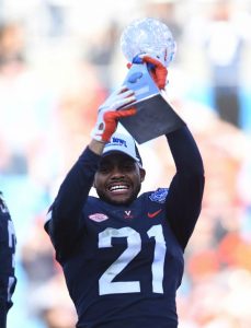 Juan Thornhill hoists the 2018 Belk Bowl championship trophy (Photo credit: South Boston News & Record).