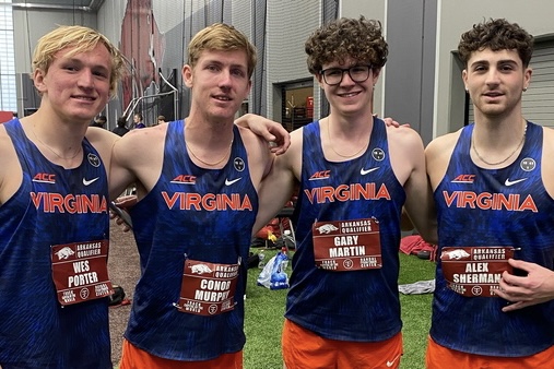 The Cavalier men kicked off the weekend of competition with a historic performance in the distance medley relay at the Arkansas Qualifier. A Virginia team of Conor Murphy, Alex Sherman, Gary Martin and Wes Porter posted a school-record time of 9:23.71 to put Virginia at the top of the ACC in the event and fourth in the NCAA.