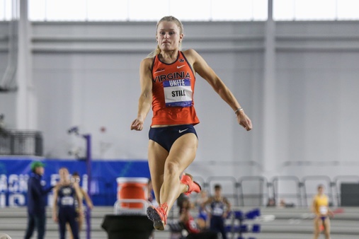 She remained in third place after throwing a personal best in the shot put of 11.64 meters (38’2.25”) and leaping to a mark of 5.97 meters (17’9”) in the long jump to put herself in striking distance with just the 800 meters to go. In the final event, Still ran 2:19.28 to place second overall in the pentathlon with 4,177 points. Her second-place finish scored eight points for the Cavaliers.