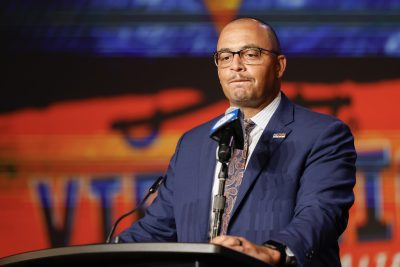 Virginia head coach Tony Elliott speaks at the 2023 ACC Kickoff in Charlotte, N.C., Wednesday, July 26, 2023. (Photo by Nell Redmond/ACC)