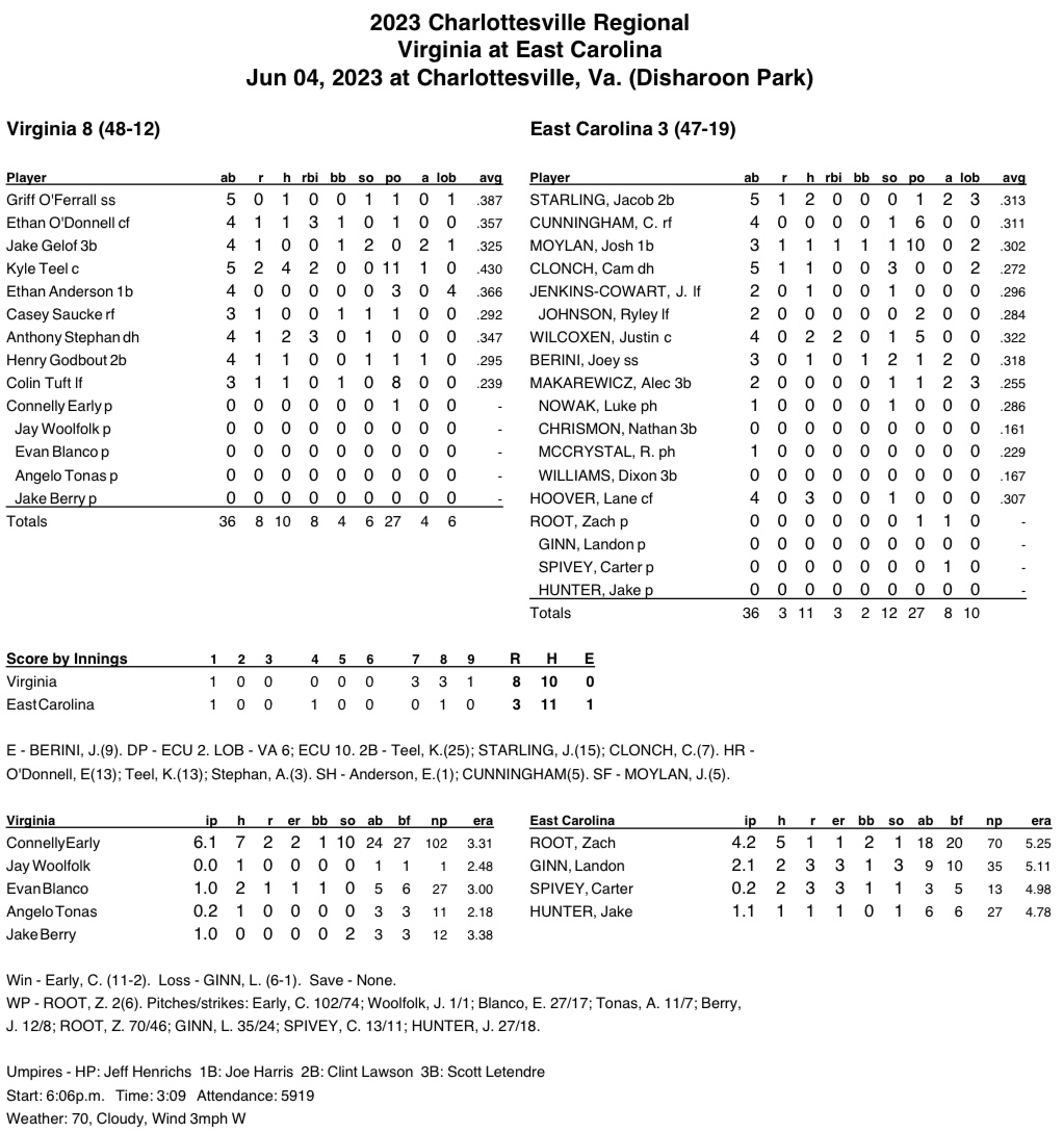 The Pirates (47-19) started the day by eliminating Oklahoma with an 8-5 victory to clinch a spot in the night game. After Teel gave Virginia an early 1-0 lead with an RBI double in the first, ECU, the home team in the contest, tied it up in the bottom-half of the frame on a sac fly from Josh Moylan.