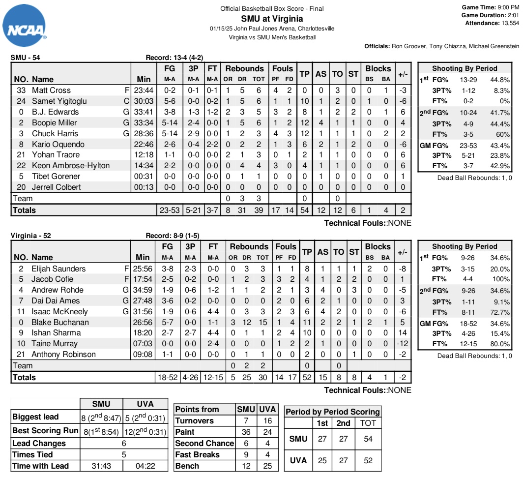 - SMU defeated Virginia, 63-51, in the inaugural ACC meeting between the teams in Dallas on Dec. 7, 2024