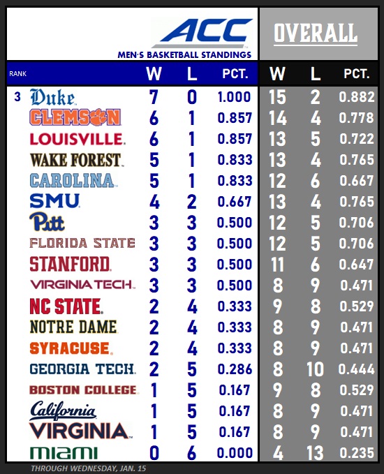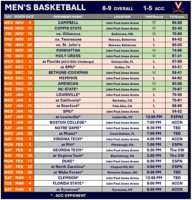 - Virginia fell to 8-9 overall, 1-5 ACC