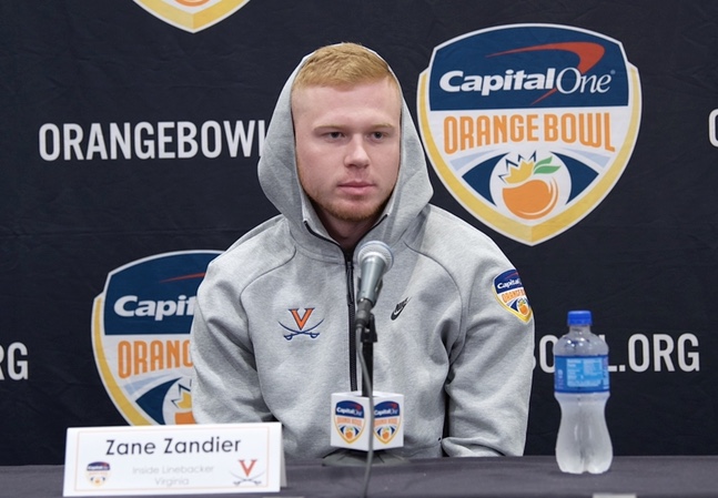 Virginia linebacker Zane Zandier takes questions on Friday in preparation for Monday’s matchup with No. 9 Florida (Photo courtesy Orange Bowl).
