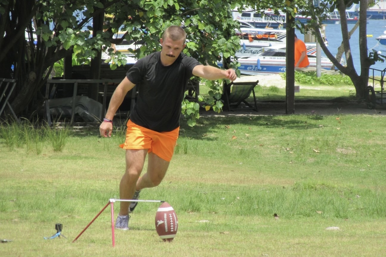 Over the eight-year journey with the Marines, sailing the oceans, being combat-ready in the Mediterranean, later serving as an instructor to new pilots, the Californian never let go of the dream. He took a cheap, beach-store, rubbery football with him for a seven-month tour at sea and kicked at every port, random islands in Thailand, booting imaginary field goals on a soccer field in Jordan, sharing American football with curious Jordanian soldiers.