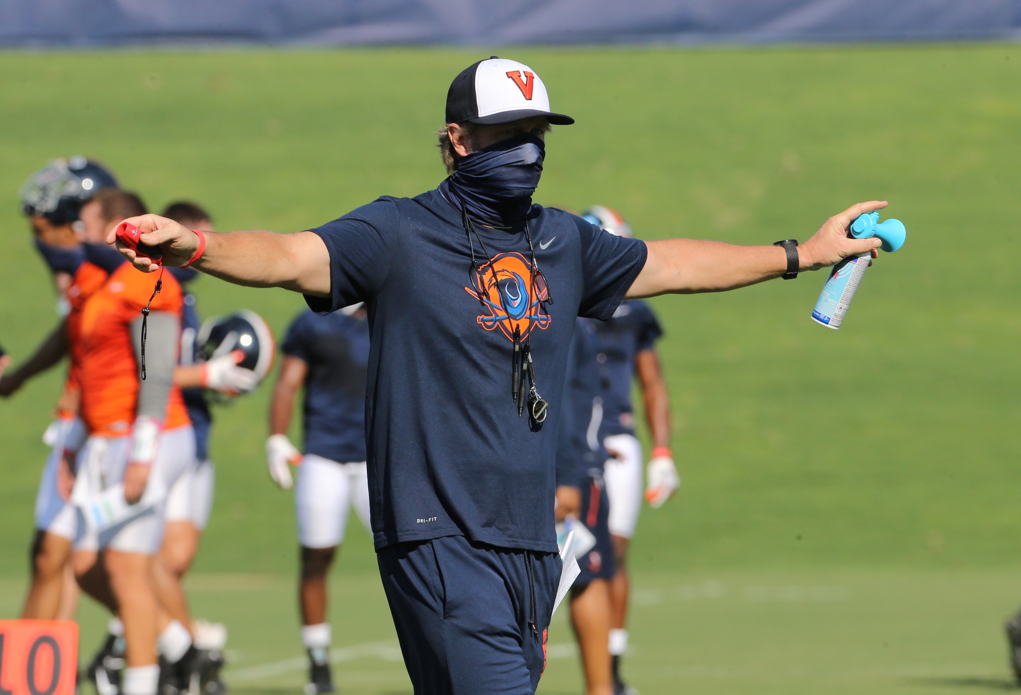 Virginia’s coaches are wearing masks in practice, the players are using full-face visors over their helmets, and some an additional cloth mask over face masks. Mendenhall monitored social distancing on the opening day of camp, requiring players putting their arms out, and if they touch anyone, the play isn’t run until the players are spaced adequately.