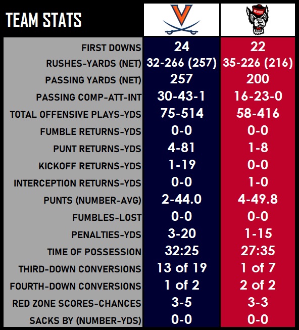 - Virginia started the game with back-to-back 75-yard touchdown drives. The Cavaliers had the ball for 20:04 in the first half compared to 9:56 by the Wolfpack.