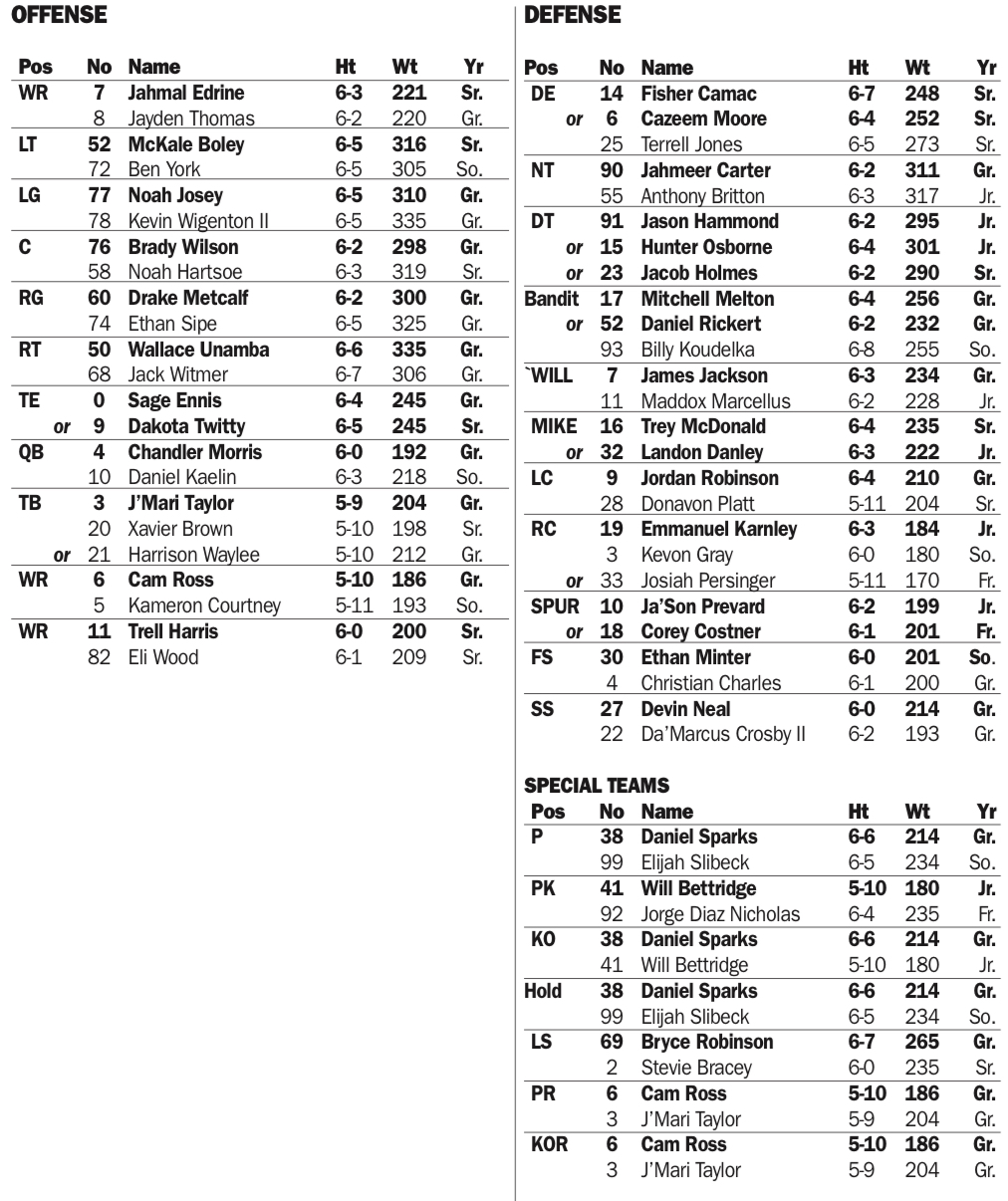 Wide receivers Jahmal Edrine (Purdue) and Cam Ross (JMU), quarterback Chandler Morris (North Texas), center Brady Wilson (UAB), right guard Drake Metcalf (Central Florida/Stanford), right tackle Wallace Unamba (New Mexico), and potential starting tailback J’Mari Taylor (NC Central). Taylor and Xavier Brown are listed as possible starters at that spot.