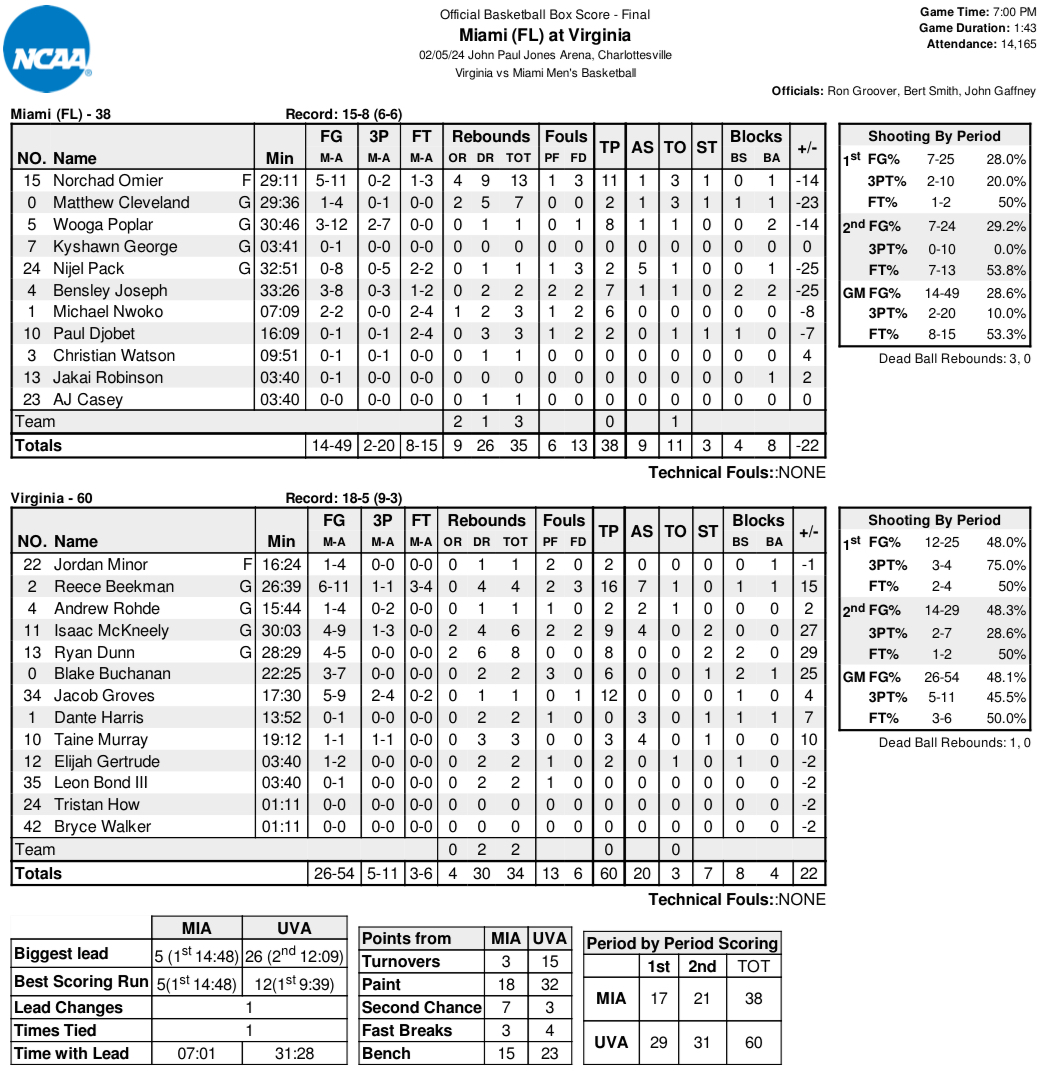 Virginia shot 48 percent (26 for 54) from the field and 46 percent (5 for 11) from long distance, making good on half of their trips to the charity stripe (3 for 6). The Cavaliers were outrebounded, 35-34, but outscored Miami 32-18 in the paint and 23-15 off the bench.