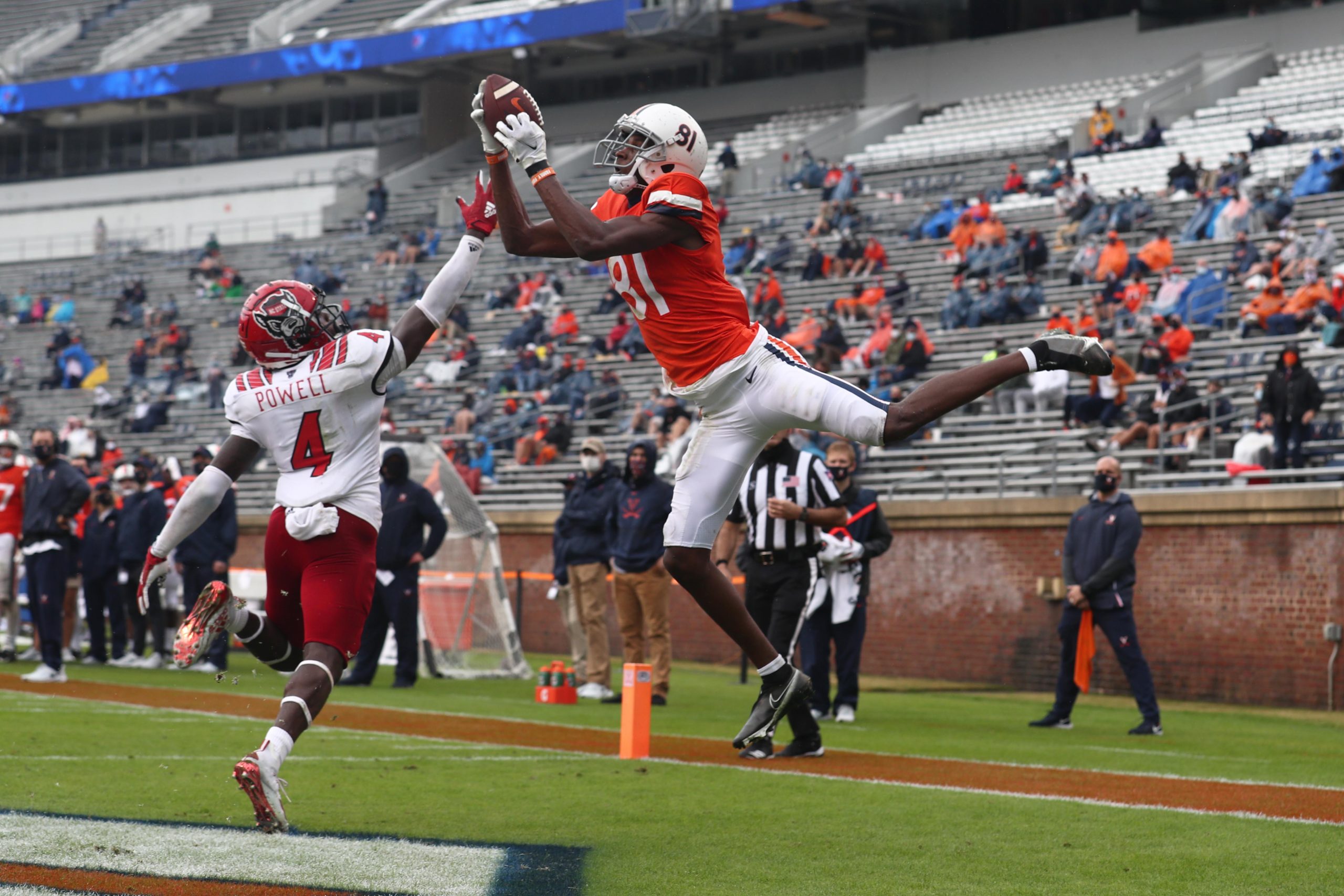 ERIN EDGERTON/THE DAILY PROGRESS Virginia Cavaliers wide receiver Lavel Davis Jr. (81) catches the ball during a game against North Carolina State Wolfpack on Saturday at Scott Stadium in Charlottesville. N.C State defeated UVa 38-21.
