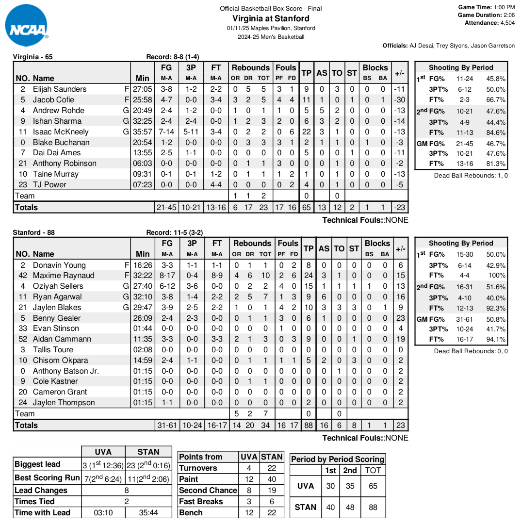Virginia got off to a fast start and led 19-16 with 12 minutes to go in the first half, but Stanford took control by halftime, 40-30. The Cardinal steadily built a lead, 68-50 halfway through the second half before the Cavaliers rallied to cut it to 73-63, thanks to a 7-0 run, with 5:04 to play.