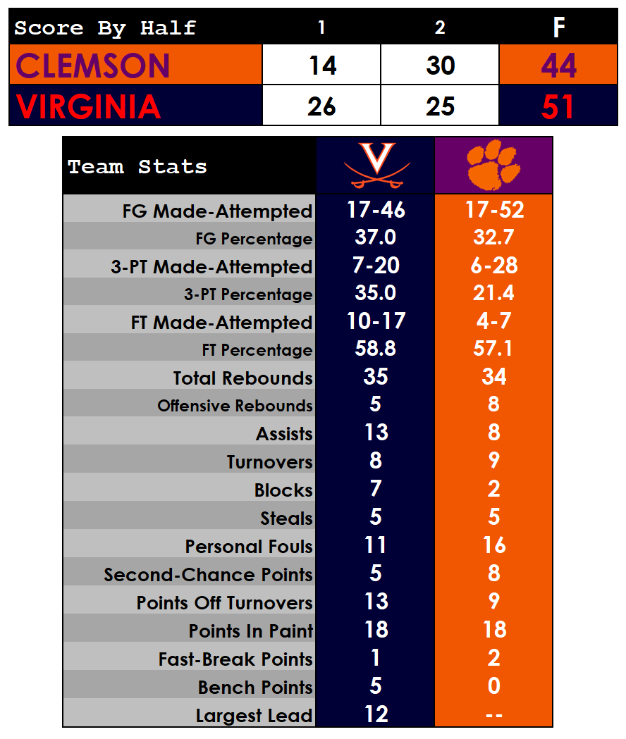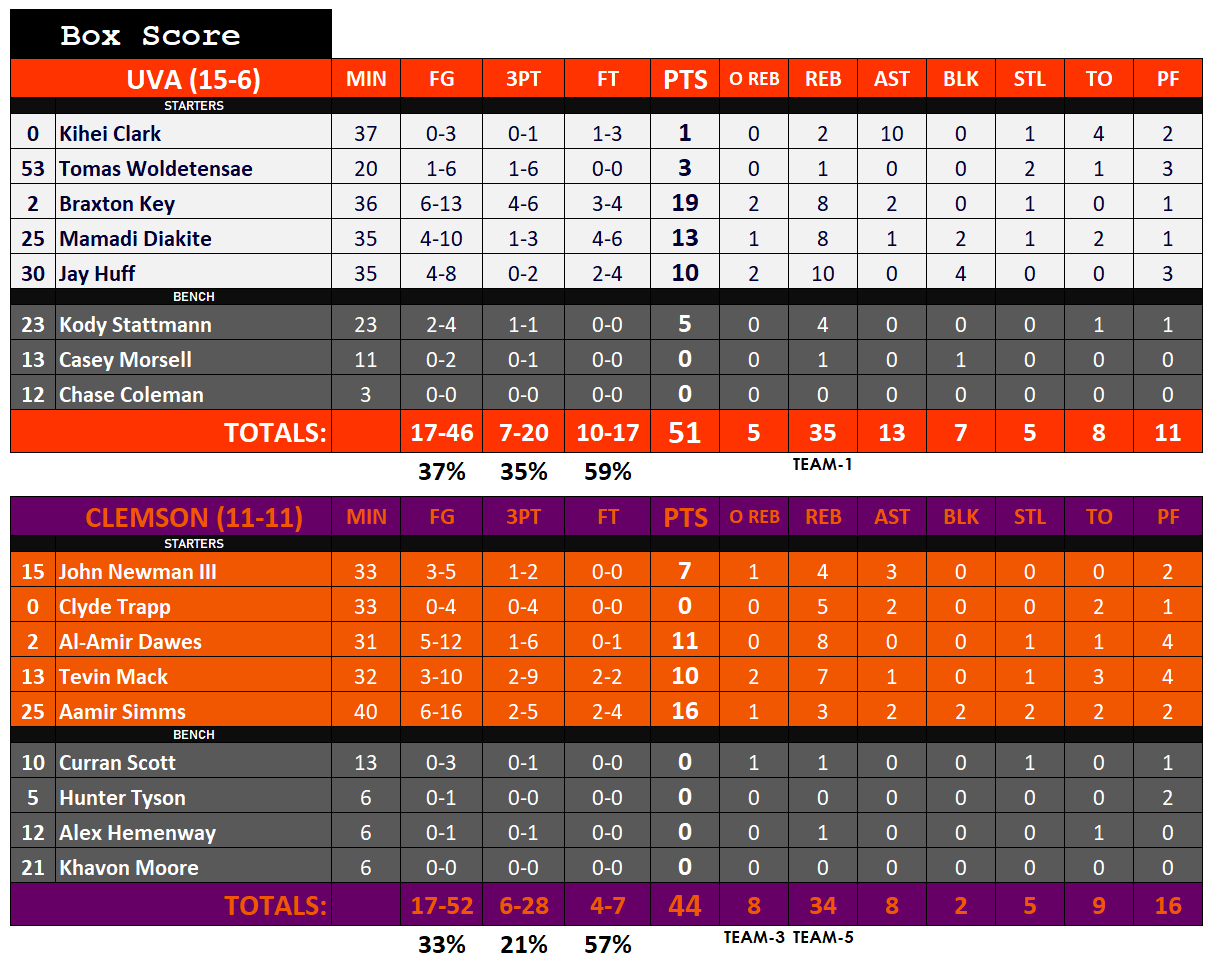 Virginia only turned it over twice before the break and six times after halftime, shooting 37 percent (17 for 46) on the night, 35 percent (7 of 20) from 3-point land. UVA grabbed 35 rebounds to Clemson’s 34, and scored 13 points off of 9 Tiger giveaways.